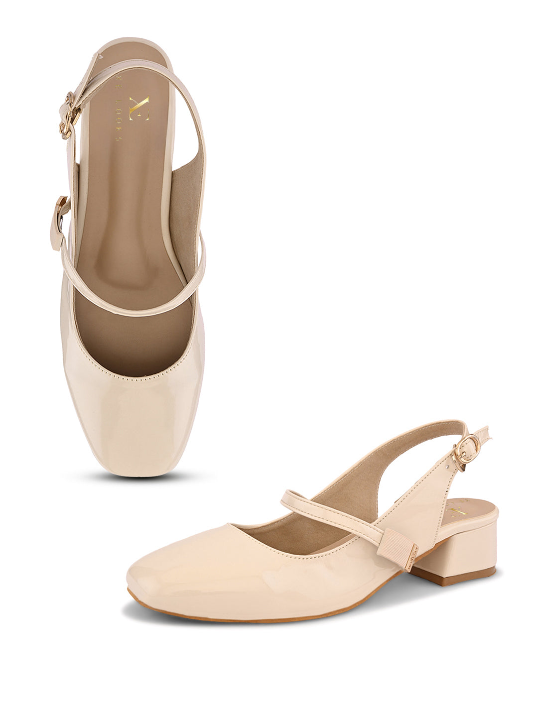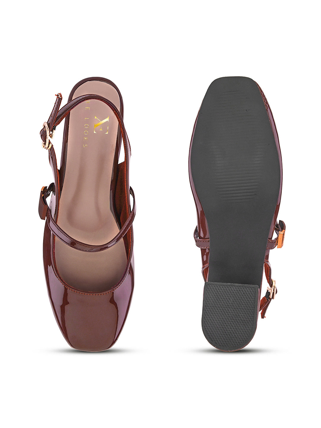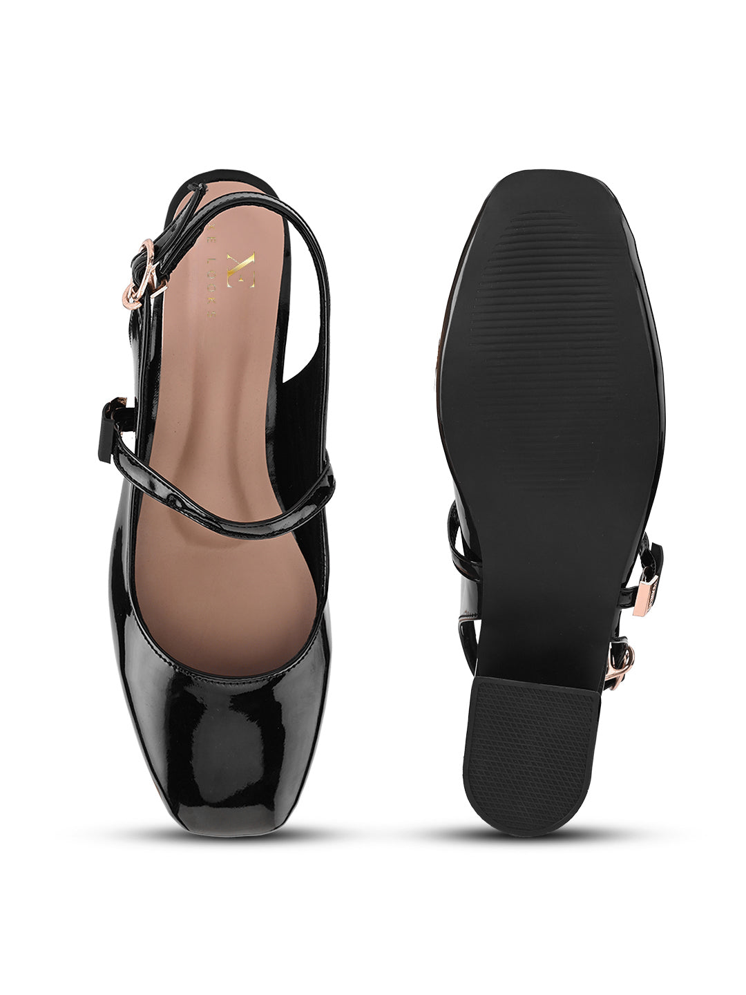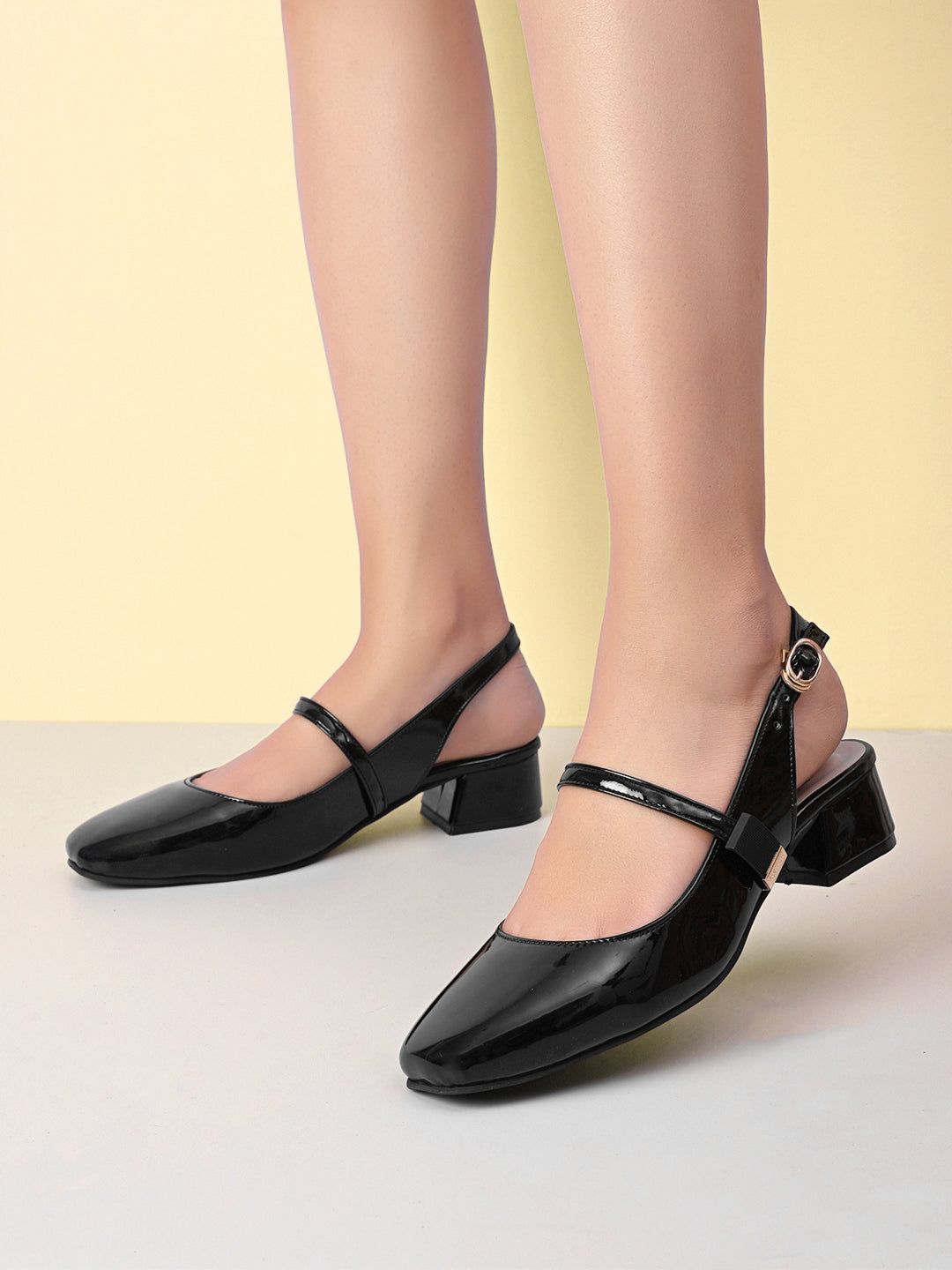 - Design: Glossy patent-finish upper with a sleek square toe and elegant cross-strap detail